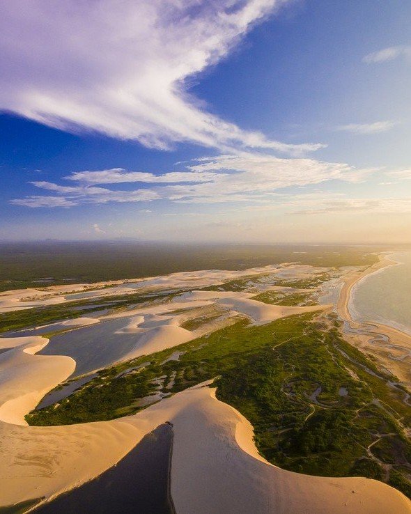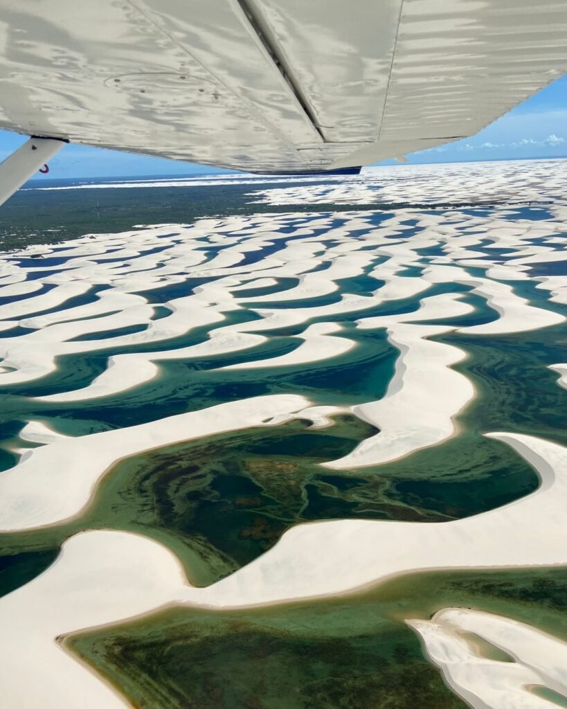 Route 2: The Coastline & Small Lençóis Perfect for those who want to see beyond the main dunes. We fly over the Small Lençóis, including Caburé, Mandacaru, and Atins, finishing over the Lagoa Azul.